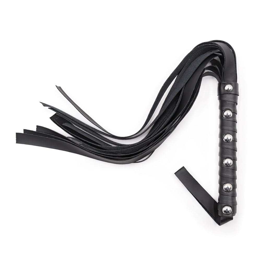 Chicote de Couro Preto com Rebites Metálicos e Design Clássico. Este chicote de couro preto é um acessório marcante e versátil, projetado para oferecer estilo e funcionalidade. O corpo principal é composto por múltiplas tiras de couro preto de alta qualidade, que se estendem a partir de um cabo robusto com rebites metálicos, garantindo durabilidade e um toque industrial. O design clássico e minimalista combina elegância e praticidade, tornando-o ideal para uso em diversas ocasiões, desde práticas íntimas até decoração ou colecionismo.Medidas aproximadas: 50 cm. Peso: 50 g. Material: PU+Metal.