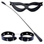 Kit Tiazinha Trio com chibata e algema acabamento Luxo de 1┬¬ linha. Confeccionada em couro sintético. Possui forro também de couro sintético na máscara, chibata é flexível e tem alãa para facilitar o manuseio e algema também em couro sintético com fecho em metal. Contém:01 máscara,01 chibata e 01 par de algemas. Dimens├Áes: Dimens├Áes: A máscara mede 18,5 cm de comprimento com largura variando entre 2 cm e 4,5 cm. A chibata mede 54 cm de comprimento. A Algema com 25cm de comprimento aberta e 1,5cm de largura. Medidas aproximadas.