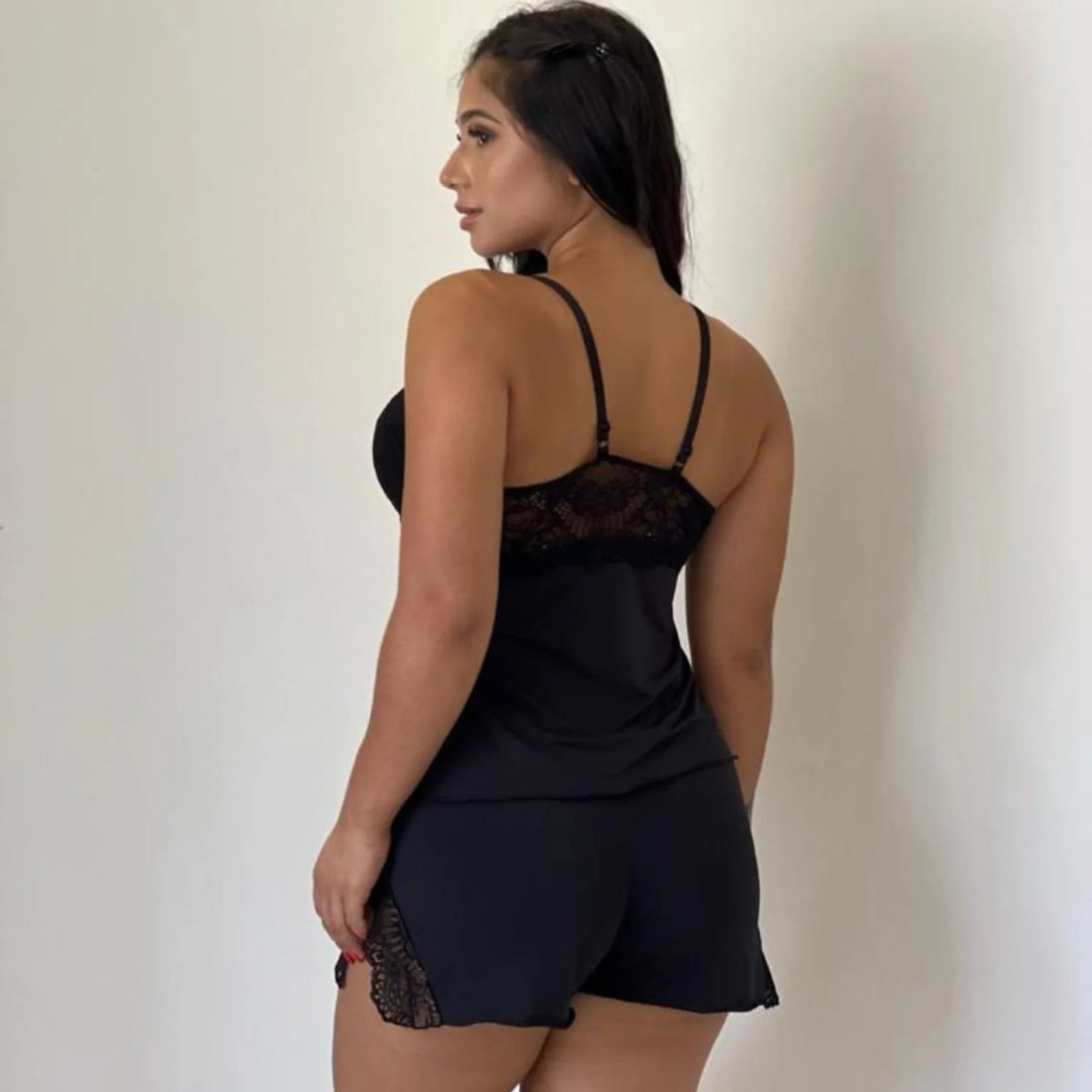 O Pijama Feminino Melinda da PATITEX é uma peãa linda e de toque suave que vai transformar seu momento de relaxamento em pura elegáncia e conforto. O short doll é composto por: ÔÖÑ´©Å Blusa com renda exclusiva no busto e uma linda aplicação de pingente. A parte de baixo é lisa, as alãas são finas, fixas e com regulagem para melhor ajuste no corpo. O mix de tecidos, proporciona um charme especial, com toque de sofisticação e sensualidade. É um modelo mais soltinho com ótimo caimento, ideal para dias quentes ou para usar em momentos especiais que você queira estar sexy e confortável. ÔÖÑ´©Å Short também conta com um mix te tecido, sendo ele liso com um lindo recorte nas laterais com aplicação de renda. O Pijama Melinda vai te proporcionar uma noite de sono com conforto e leveza, além de deixa-la linda para todos os momentos. Porque usar o Pijama Feminino Melinda da PATITEX? Uma rotina noturna pode melhorar a qualidade do sono, e uma peãa de roupa leve é um ótimo investimento para ter esse conforto noturno. O Pijama Feminino Melinda é uma peãa ideal para quem deseja estar confortável e ter uma bela noite de sono em dias quentes, pois por ser desenvolvido com material leve não esquenta e torna seu uso mais confortável. Ô£¿Vantagens: • Material leve e macio; • Decote rendado; • Extremamente confortável; • Secagem rápida; • Moderno e sofisticado; • Sexy e ousado; Contém: 01 Blusa e 01 Short. Composião: Tecido 90% Poliamida e 10% Elastano.