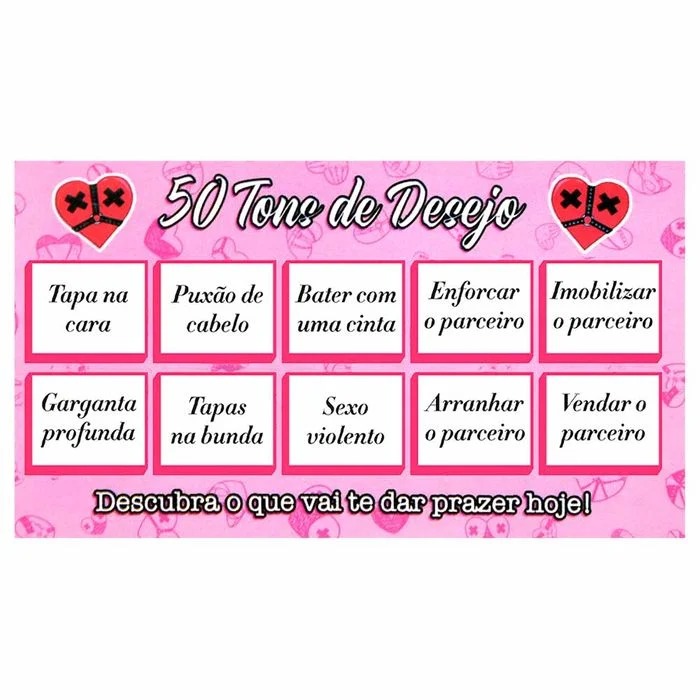 Raspadinha 50 Tons de Desejo 1 Unidade da Sensual Love. Transforme seus momentos íntimos em uma experiência ardente e excitante. Este jogo é perfeito para apimentar sua vida sexual com seu parceiro(a), proporcionando uma maneira lúdica de explorar novas posiões e intensificar o prazer. Jogo Divertido e Excitante: A Raspadinha 50 Tons de Desejo é um jogo que adiciona um toque de diversão e novidade ão ato sexual. Simples de Usar: Utilize uma moeda, chave ou a própria unha para raspar os quadrinhos e descobrir a posião indicada.